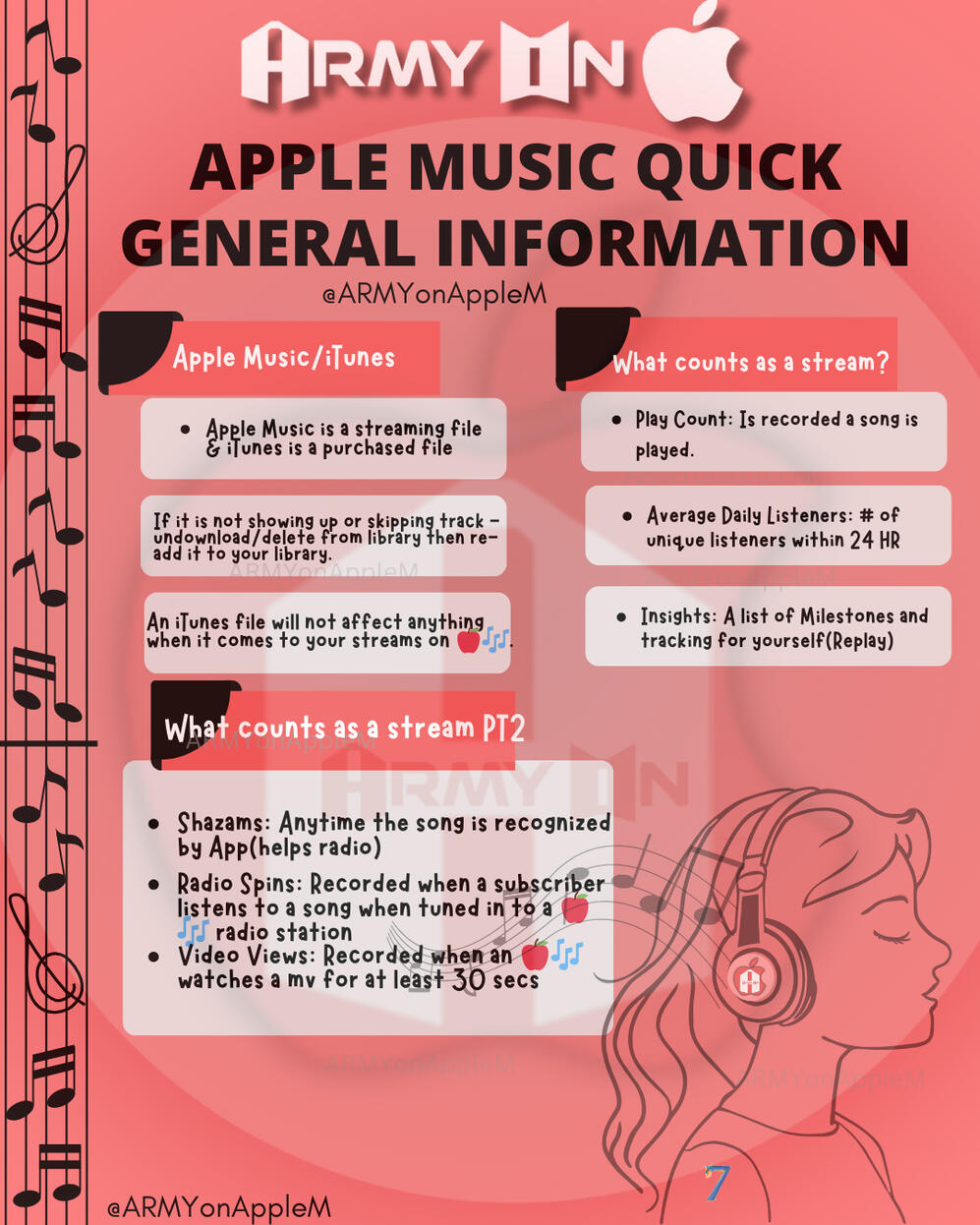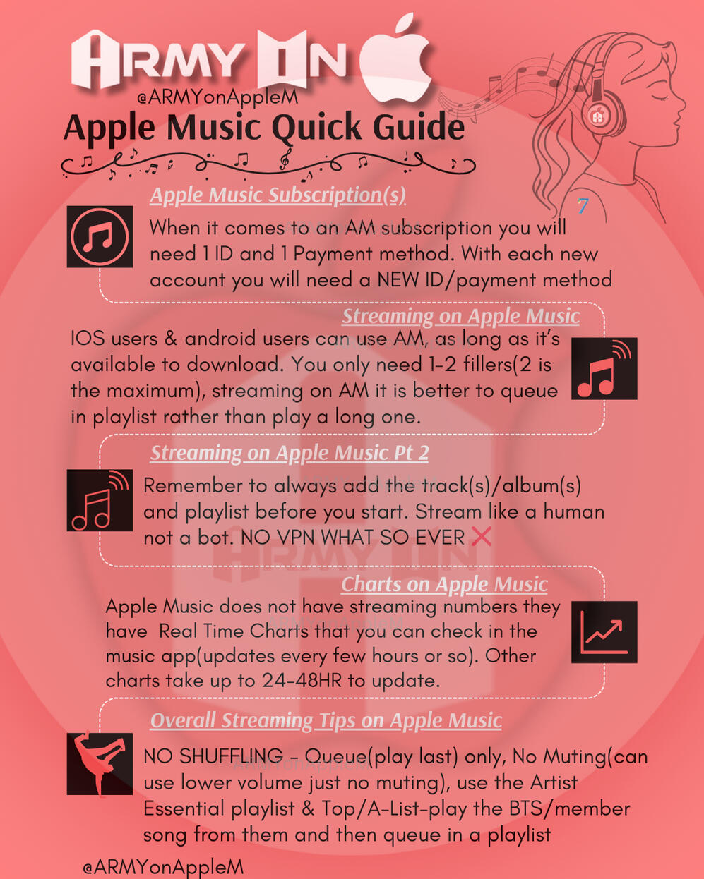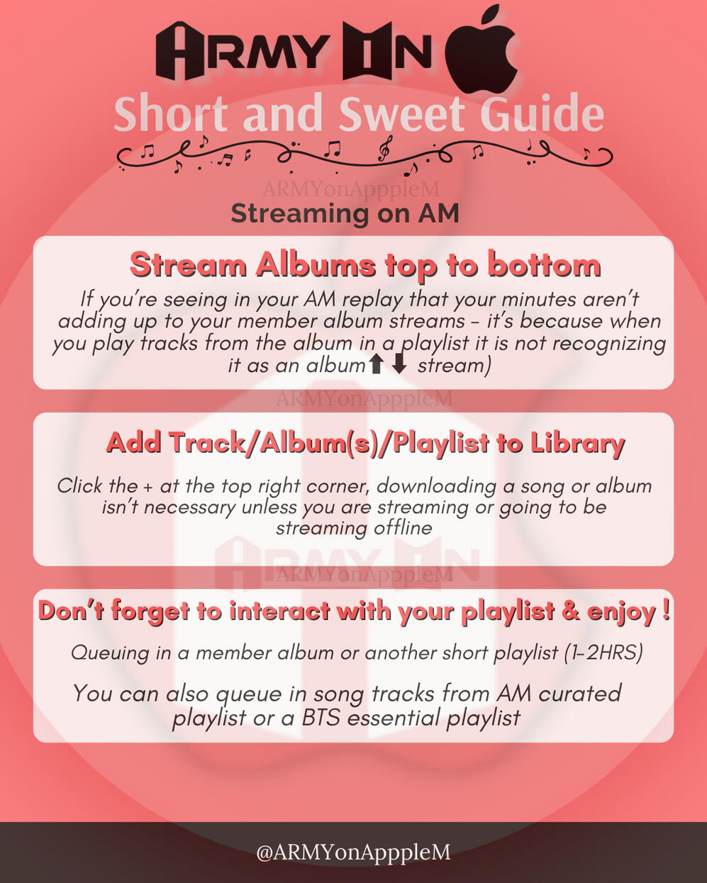 Hello, we are #ARMYonAppleMusic. This fanbase is a part of ARMYON Brand. As an Apple Music Fanbase, we provide playlists, and guidance to help stream, and chart data. Our main focus is premium streams for BTS stability and the longevity of their artistry.